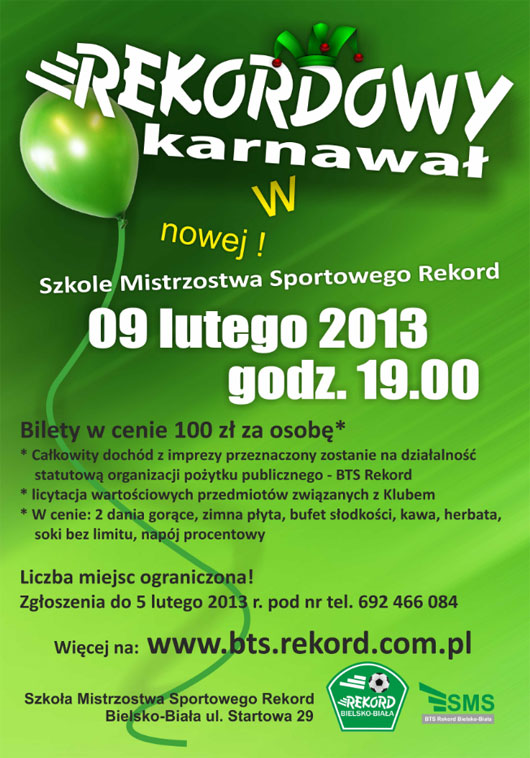 Zapraszamy wszystkich sympatyków Beskidzkiego Towarzystwa Sportowego Rekordna zabawę pod hasłem „Rekordowy karnawał”, która odbędzie się 9 lutego br. w Szkole Mistrzostwa Sportowego w Cygańskim Lesie.